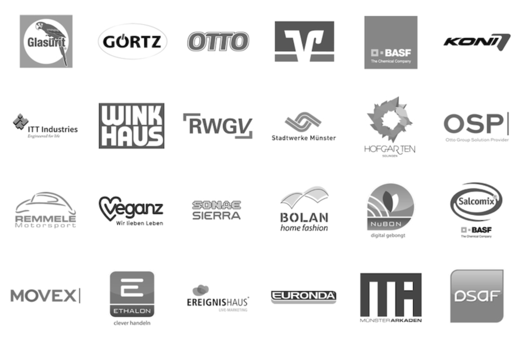 BASF Coatings GmbH - Beiersdorf AG - DSAF Dr. Schengber & Friends - ETHALON - EURONDA- Otto Group - GLASURIT - GÖRTZ - Hofgarten Solingen - ITT Industries - KONI - KRAWUMMEL different dining - MOVEX - Münster Arkaden - NUBON - OSP OTTO solution provider - RM Paint - RWGV Rheinisch-Westfälischer Genossenschaftsverband e.V. - SALCOMIX - Sonae Sierre - Stadtwerke Münster - VEGANZ - WINKHAUS
